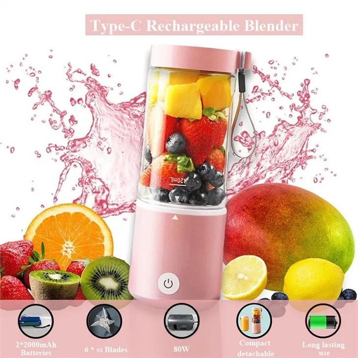 * The Type-C rechargeable Blender stops automatically after 20 seconds and mixes fruit completely. * easy to use and One-button clean * Safe: Safety Protection System. * 6 Strong Blades: Lift and push down quickly, sturdy on the bottom, and not easy to loose. * The Type-C rechargeable Blender cup is made of high-quality food-grade PC materials, BPA free * The Type-C rechargeable Blender cup can be used separately, so you don't have to pour the juice into another cup.